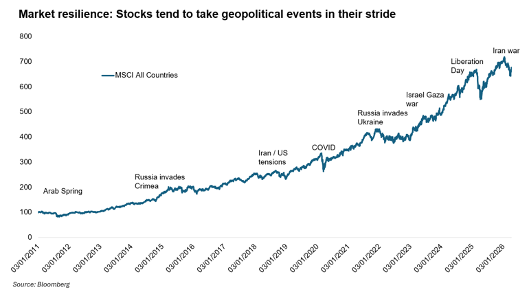 History tells us that geopolitical shocks, however painful in the short-term, rarely derail equity markets over the longer-term. Even prolonged conflicts tend to have limited long-run consequences and those that were short-lived often proved to be significant buying opportunities.